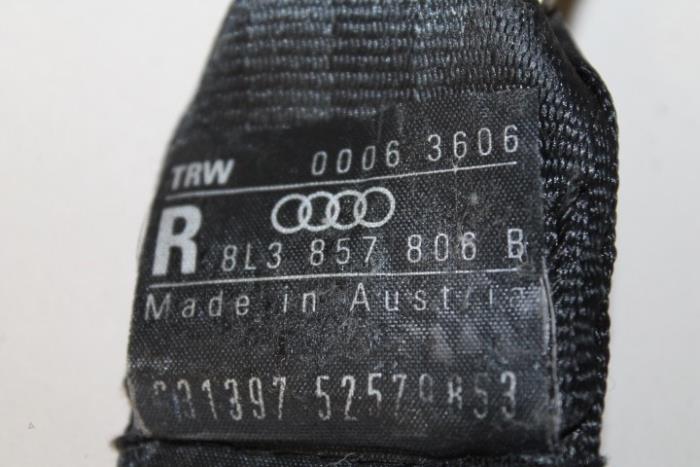 3-punts veiligheidsgordel met oprolautomaat en gordelspanner rechts achter (gordel dient goed schoongemaakt te worden) Kleur: Zwart Kleurcode: V04 Fabrikant: OE Vergelijkingsnummer: 8L3857806B V04