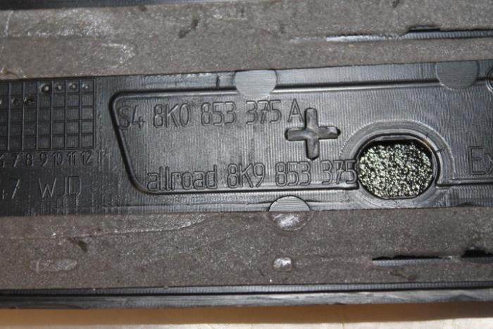 Dorpellijst/instaplijst links achter, Allroad quattro tekst erop Kleur: Satijnzwart Kleurcode: 01C Fabrikant: OE Bevestigingspunten zijn afgebroken, Nog wel te monteren dmv plakstrips. Vergelijkingsnummer: 8K9853375 01C
