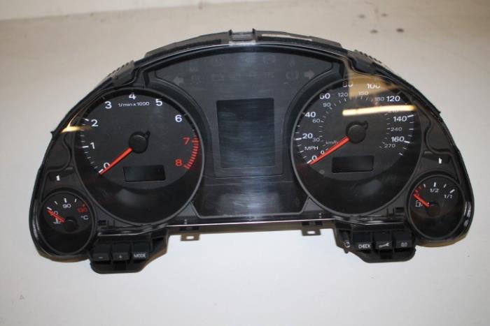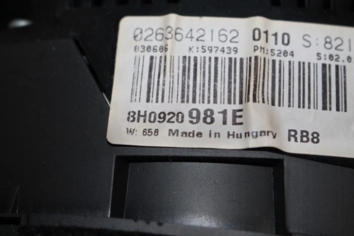 Instrumentenpaneel/km teller ENGELS (rechtsgestuurde wagen) (MPH) Fabrikant: OE Vergelijkingsnummer: 8H0920981E Instrumentenpaneel dient nog gecodeerd/ingeleerd te worden. Tegen een geringe meerprijs is dit bij ons mogelijk.