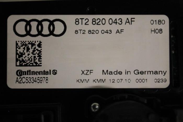 Climatronic paneel / weergave-en bedieningseenheid voor elektron. geregelde airconditioning ENGELS (rechtsgestuurde wagen) Kleur: Chroomglans/zwart Kleurcode: XZF Fabrikant: OE Heeft kras op behuizing!!! Vergelijkingsnummer: 8T2820043AF XZF