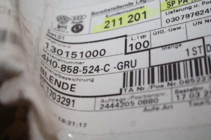 Afdekking voor buitenspiegelhuis rechts onder (wagens met zijcamera) Kleur: Gegrond Kleurcode: GRU Fabrikant: OE Vergelijkingsnummer: 4H0858524C GRU