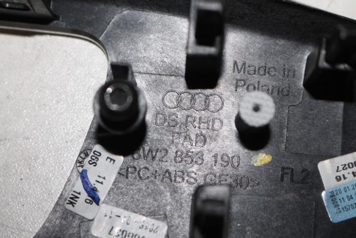 Sierlijst dashboard ENGELS (rechtsgestuurde wagen) Kleur: Aluminiumzilver-geborsteld Kleurcode: 1NK Fabrikant: OE LET OP!!! HEEFT EEN KRASJE EROP!!! Vergelijkingsnummer: 8W2853190E 1NK