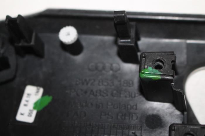 Sierlijst dashboard ENGELS (rechtsgestuurde wagen) Kleur: Aluminiumzilver-geborsteld Kleurcode: 1NK Fabrikant: OE LET OP!!! HEEFT WAT KRASJES!!! Vergelijkingsnummer: 8W2853189K 1NK