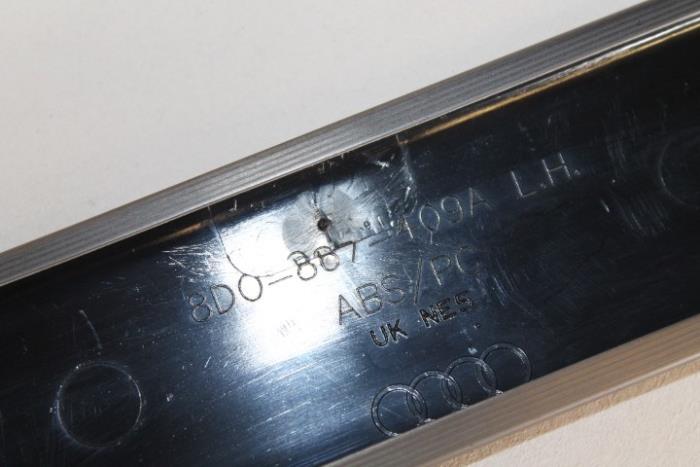 Sierlijst portier links voor Kleur: Aluminium Kleurcode: Z53 Fabrikant: OE Lijst heeft een diepe kras erop (zie foto) Vergelijkingsnummer: 8D0867409A Z53