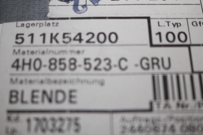 Afdekking voor buitenspiegelhuis links onder (wagens met zijcamera) Kleur: Gegrond Kleurcode: GRU Fabrikant: OE Vergelijkingsnummer: 4H0858523C GRU